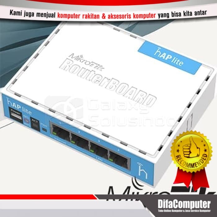Router Wireless RB941-2nD (hAP-Lite) Home Access Point Lite. RB941-2nD memiliki semua kebutuhan router dan gateway untuk segala kondisi jaringan. Memiliki 4 buah port ethernet, 1 buah access point embedded 2,4 GHz, antenna embedded 2×1,5 dbi. Sudah termasuk power adaptor.